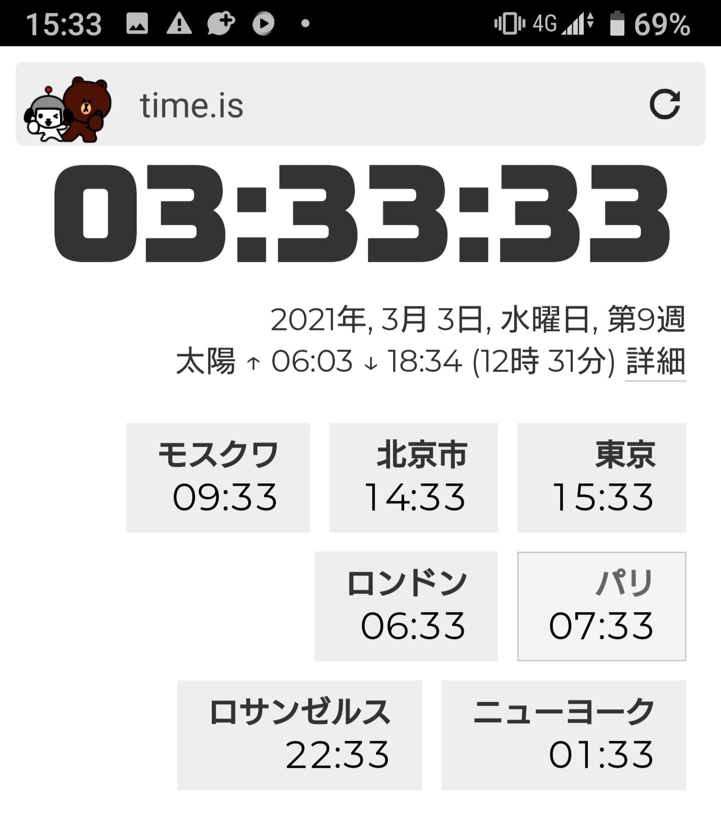 3時33分33秒を狙って、スマホの画面を残したかったけど、どうして15時33分になってしまうので、ブラジル・サンパウロ時刻を表示してスクショしてみた・・・♪
