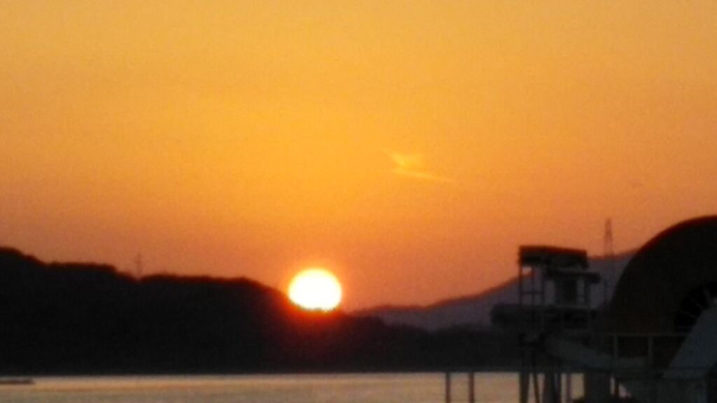 尾道水道の向こうの山から沈む太陽があんまりにでっかくてキレイだったので