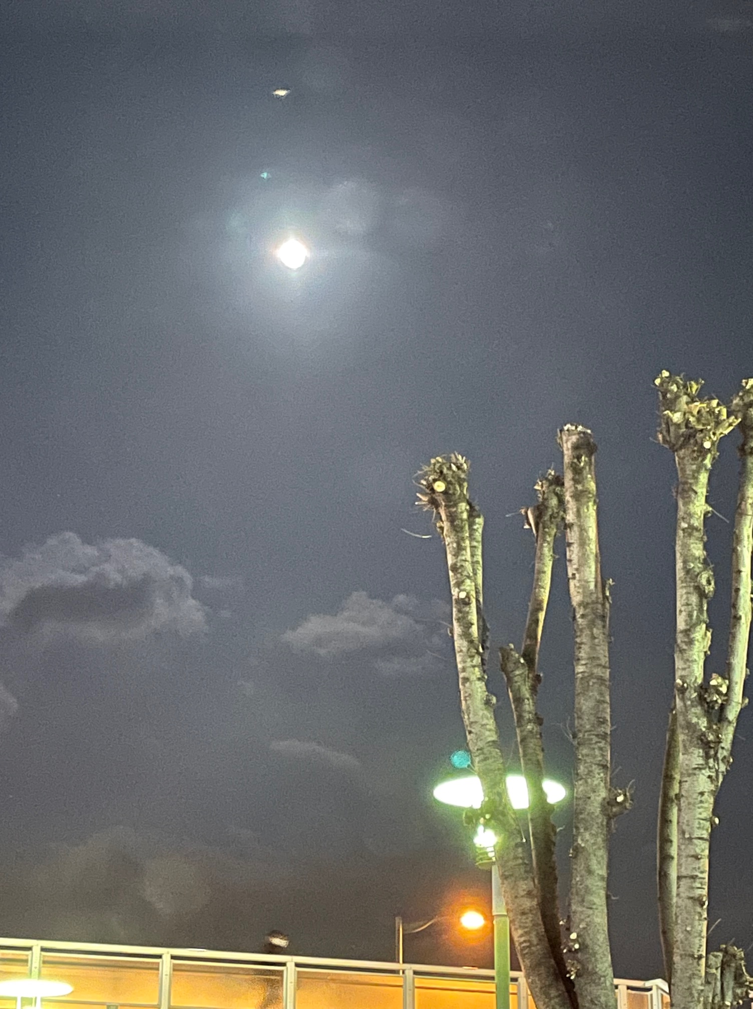 今日は、日中は暖かく、外は霞がかかってぼやけた感じでした。庭にメジロがやってきて、写真撮りましたが、どこにいるか分かるかなぁ?そして、番組が始まる頃には東の空に見えたり隠れたりしながら十三夜の丸いお月さまが。
