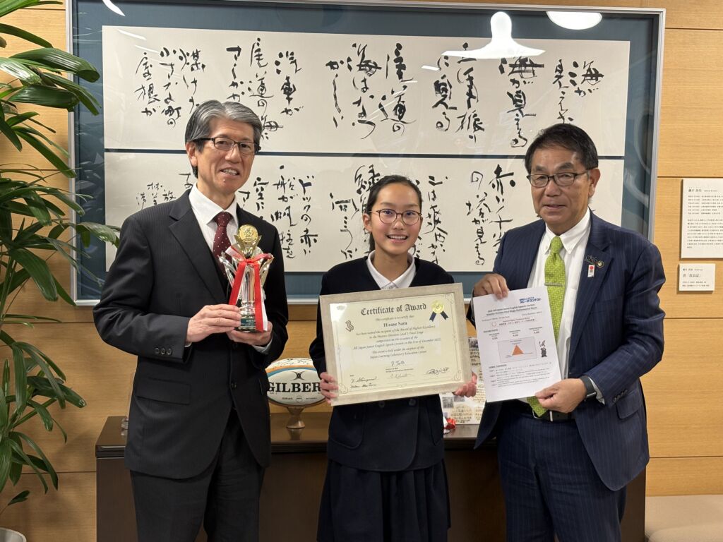一般社団法人日本ラーニング・ラボラトリー教育センターが主催する「第48回全国ジュニア英語スピーチコンテスト」Masters Division(オリジナル英作文部門)で向東小学校6年の平瀬紗良さんが最優秀賞日本LL教育センター代表理事賞を受賞。