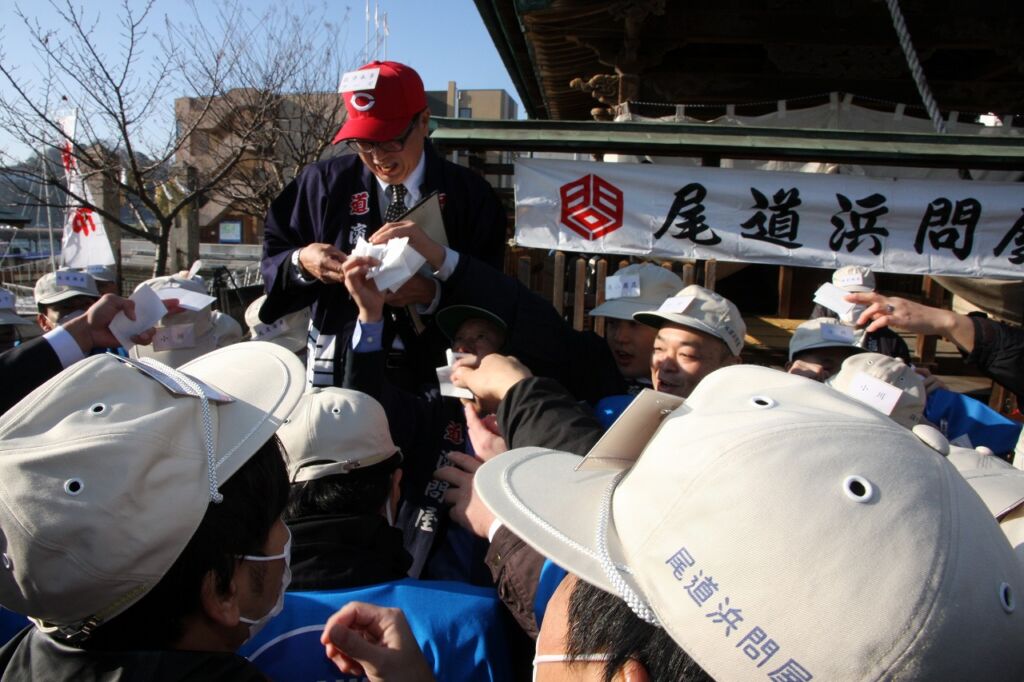 尾道浜問屋組合の新年初市は江戸時代から300年以上続く伝統の行事で、かつてはこの初市での競り値がその年の相場を占うとまで言われていました。