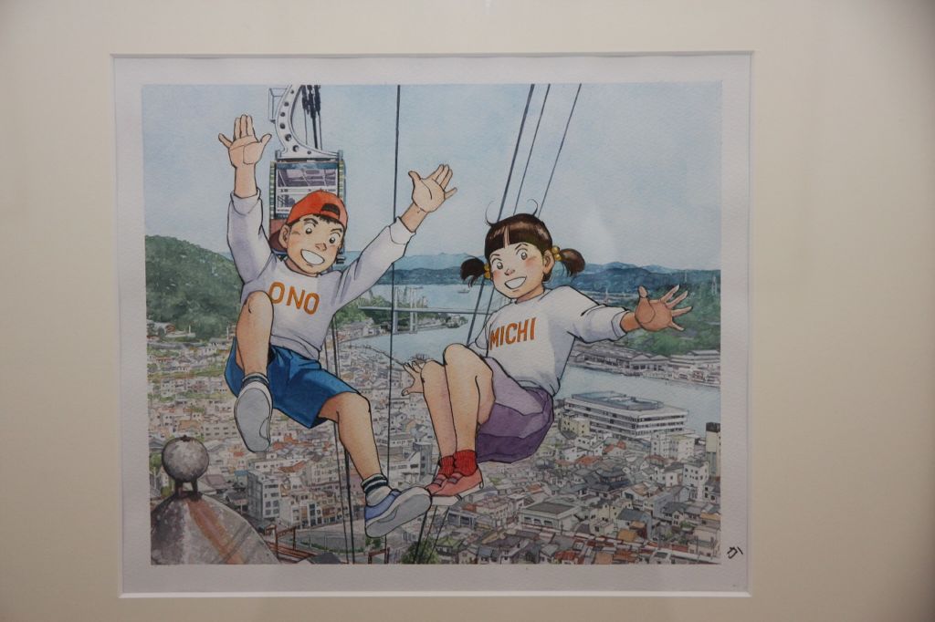 尾道市立美術館で新収蔵品を含む86点で「コレクション展 描かれた尾道水道」が開催中です。新収蔵品は歌川貞秀の浮世絵「西国名所之内 十六 備後尾の道浄土寺山」(写真:上)です。「チーム尾道 頑張ろう応援商品券」に描いた かわぐちかいじさんのイラスト原画(写真:中)、名誉市民 小林和作の作品(写真:下)が展示されています。会期は来年1月17日までです。