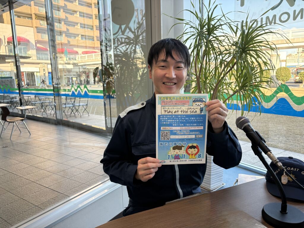 尾道海上保安部交通課 篠原匠さんに「年末年始特別警戒及び安全指導」「冬季の急速に発達する低気圧に注意」「安全啓発ソング Play at the sea(ぷれーしー)」についてご紹介いただきました。