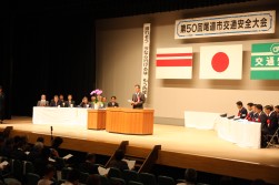 尾道市と尾道交通安全協会、尾道商工会議所が主催する第50回尾道市交通安全大会が10月2日午後1時30分から尾道市公会堂で約500人が参加して開かれました。交通事故犠牲者に対する黙祷のあと、交通功労警察職員、交通安全功労団体、交通安全特別功労者、優良運転者の各種表彰が行われました。市内の小中学生による交通安全作文の本人発表では、栗原北小学校3年の東涼士さん、栗原小学校5年の高垣直矢さん、長江中学校1年の加納沙緒璃さんの3名が作文を発表しました。第2部のアトラクションでは村上水軍陣太鼓の演奏がありました。(写真 上:交通安全作文を発表する東涼士さん 中:大会宣言する尾道安全運転管理協議会 杢谷正樹会長 下:アトラクションの因島村上水軍陣太鼓)