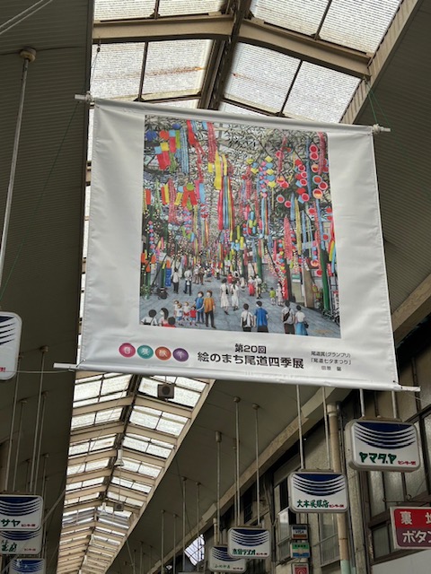 商店街に「絵のまち尾道四季展」の横断幕がでてるよ