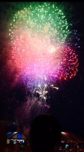 ※写真の左上に写っている白い物は、少し膨らんだ半月(?)です。花火との競演♪