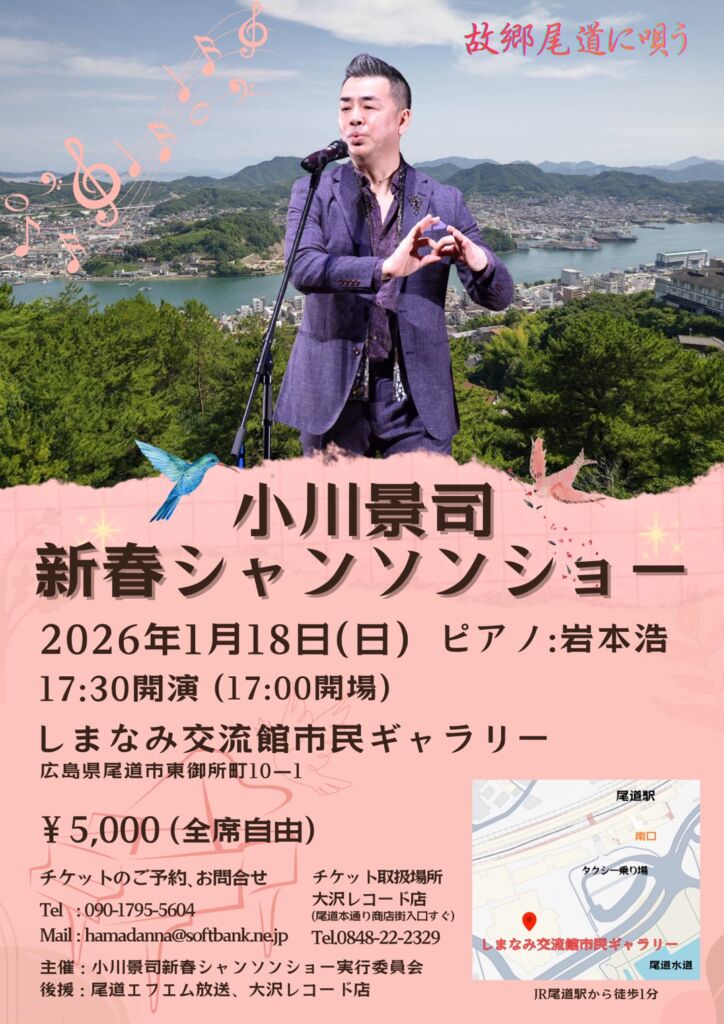 尾道出身の歌手・小川景司さんに、2026年1月18日(日)、しまなみ交流館市民ギャラリーで開催の新春シャンソンショーについて、ご紹介いただきました。