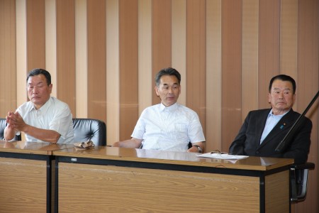 議長選立候補者の3人(左: 寺本真一・議員 <日本共産党>、中: 藤本友行・議員 <新風クラブ>、 右: 吉田尚徳・議員 <新和会>)