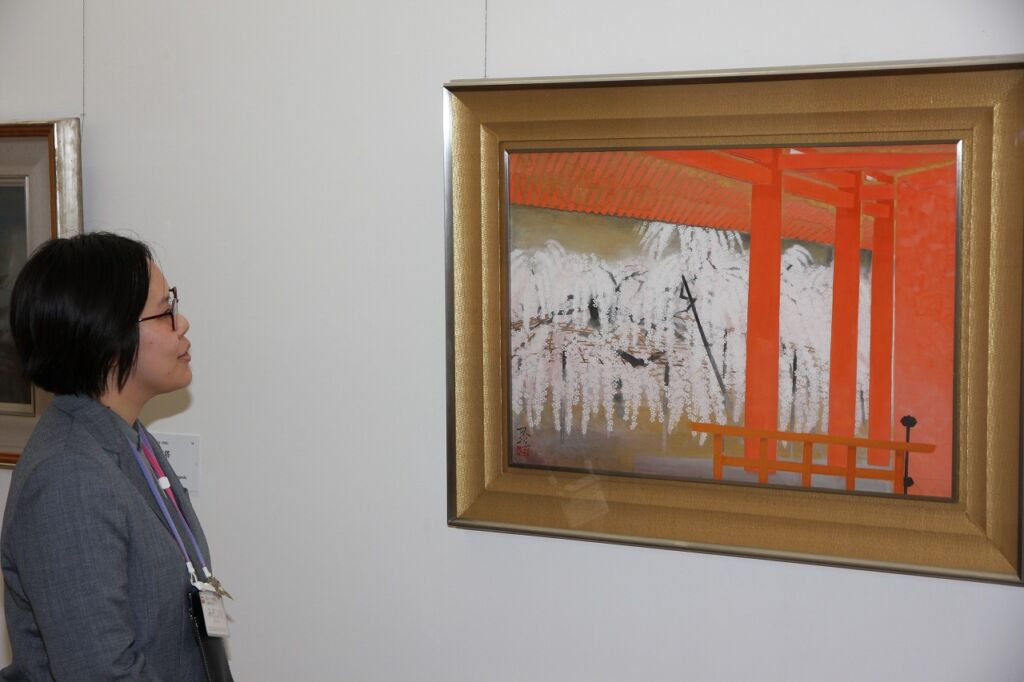 尾道市立美術館で3月7日から始まる「京の百景 描かれた京都の四季」が報道陣へ公開されました。この展覧会は京都府が美しい古都の佇まいを後世に伝えようと、昭和46年~47年(1971~1972)に京都画壇を代表する日本画家 小野竹喬、上村松園などに制作委嘱した83点が、観光地をめぐるように「洛北」「洛南」など京都の地域ごとに展示されています。会期は5月6日まで。(写真:秋野不矩「平安神宮」)