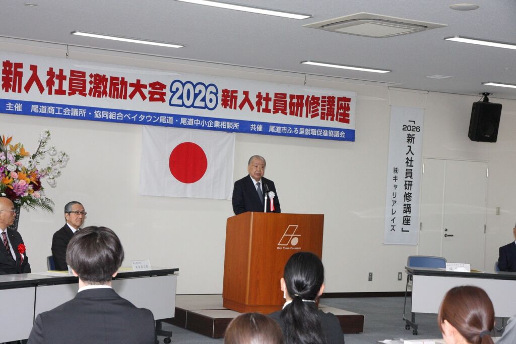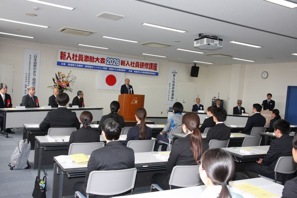 尾道商工会議所と協同組合ベイタウン尾道、尾道中小企業相談所は4月7日と8日に、ベイタウン尾道 組合会館で2026年新入社員激励大会・新入社員研修講座を開き、27の事業所から87人が参加しました。