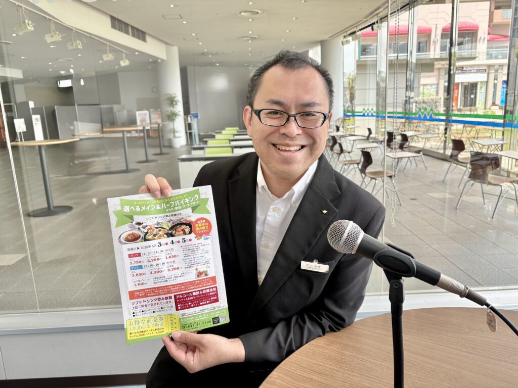5月3日(日)、4日(月)、5日(火)の3日間限定の「選べるメイン&ハーフバイキング」について、グリーンヒルホテル尾道の村上朋伸さん(写真)と青木結愛さんにご紹介いただきました。