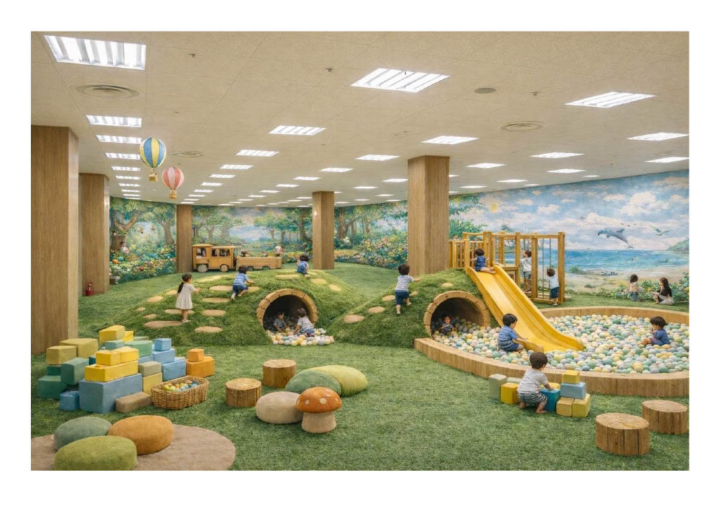 注目施策は、尾道福屋跡 地下1階の75%、1300㎡に新設する「室内子ども広場」で、室内遊戯スペース、フリースペース、事務室、授乳室、トイレを整備します。